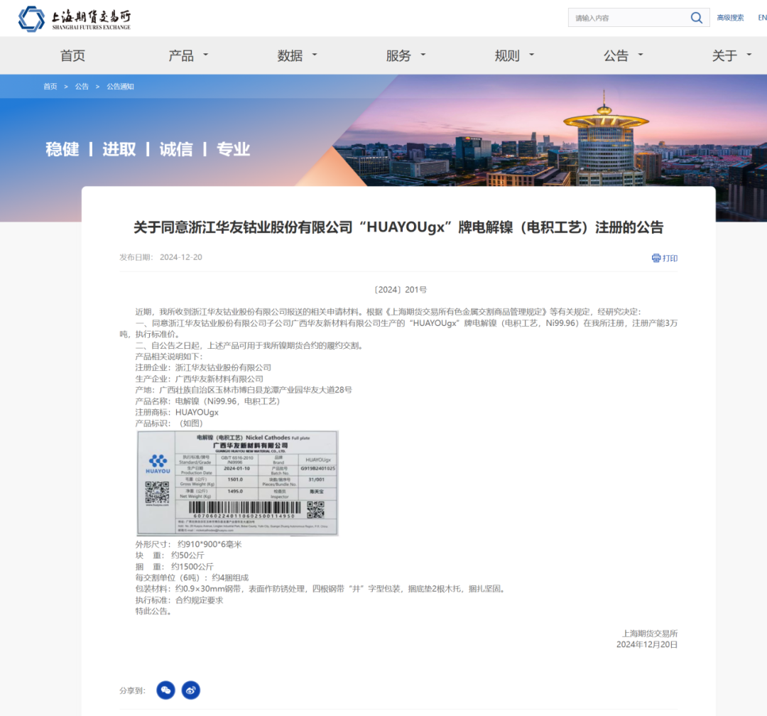 12月20日,華友鈷業(yè)子公司廣西華友新材料有限公司生產(chǎn)的“HUAYOUgx”牌電解鎳(電積工藝,Ni99.96)成功在上海期貨交易所(以下簡(jiǎn)稱(chēng)“上期所”)注冊(cè),注冊(cè)產(chǎn)能為3萬(wàn)噸。