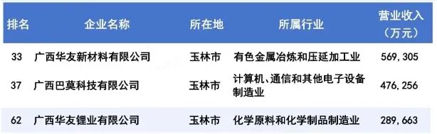廣西制造業(yè)民營(yíng)qm球盟會(huì)·(中國(guó))球盟會(huì)100強(qiáng)榜單中,廣西華友新材料有限公司位列第24名,廣西巴莫科技有限公司排名第26位,廣西華友鋰業(yè)有限公司位居第41名。